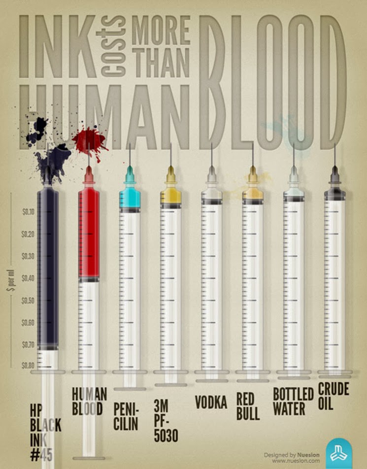 Nunca nadie se ha planteado que la tinta es el líquido más caro del mundo? más que la gasolina, perfumes de alta gama o incluso la sangre? Si nos fijamos que estamos pagando de media 10€ por un misero cartucho de 4ml de tinta negra, hagan el calculo... Obviamente en ese precio también te cobran el recipiente, aunque luego te lo ponen difícil su recarga, algo totalmente inmoral para el medio ambiente como al consumidor.